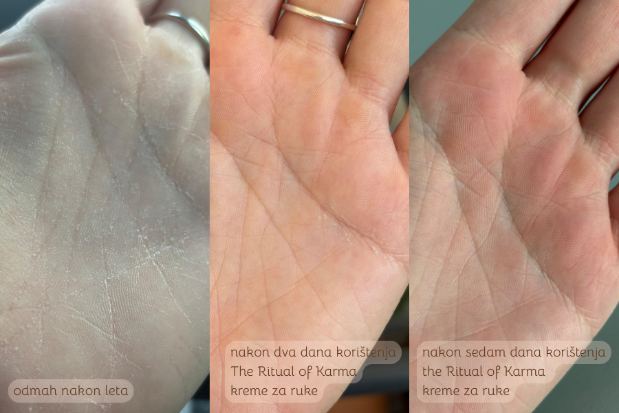 Upotrebljavam ju već nekoliko tjedana tek jednom dnevno prije spavanja i adekvatno zadovoljava potrebe moje suhe kože ruku. Pruža dugotrajnu hidrataciju, stoga ju nemam ni potrebu češće aplicirati što je rijetkost za mene kada su u pitanju kreme za ruke. Zanoktice mi ne hidratizira idealno, ali za njih ionako upotrebljavam ulje za zanoktice tako da to ne smatram velikim nedostatkom. Najveći je test bila suhoća ruku nakon letenja avionom koju je The Ritual of Karma krema za ruke uspješno zacijelila tijekom tri dana korištenja.