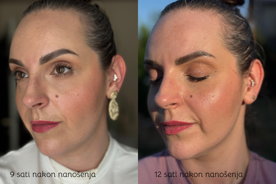Nakon pet sati nošenja mrvicu mi se uvukao u pore na obrazima (što je izraženije ako ga setiram), no i dalje nije bilo naznaka da se uvlači u bore ili nakuplja na određenim dijelovima. Devet sati nakon nanošenja primijetila sam prva (blaga i gotovo nezamjetna, osim pomnom inspekcijom) nakupljanja u mimičkim borama, no tada je izgled kože postao isuviše sjajan za mene te sam imala potrebu blottati ga. Ipak, puder se minimalno "skinuo" i to ravnomjerno tako da nije izgledao neuredno.