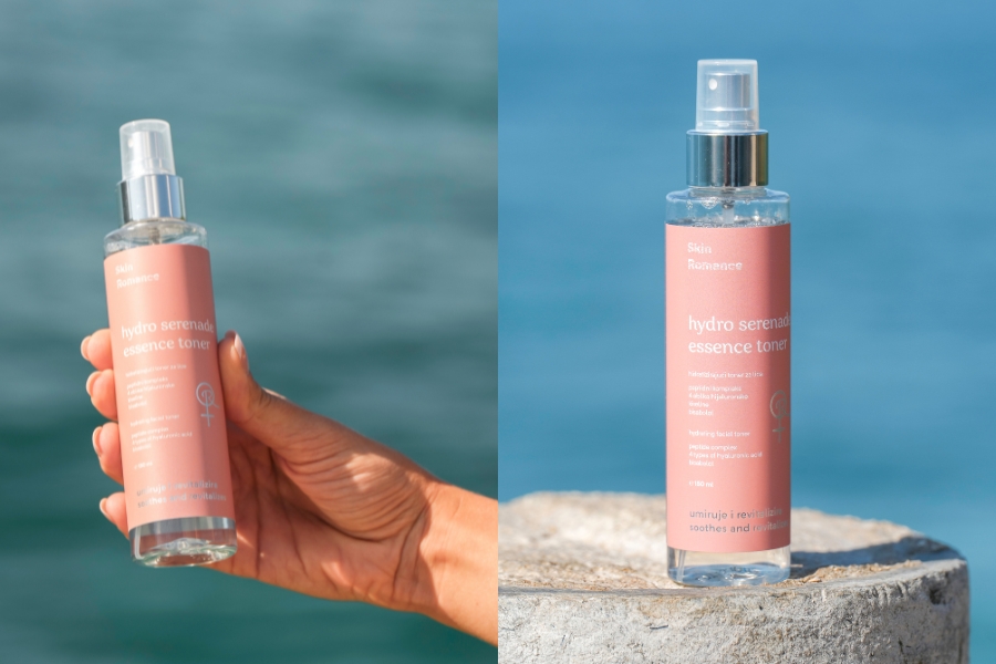 Uz gel, drugi proizvod koji će postati i drugi korak vaše svakodnevne routine jest Skin Romance Hydro Serenade Essence Toner – hidratizirajući toner za lice. Nakon čišćenja sa Skin Romance pjenušavim gelom, ovaj hidratizirajući toner umirit će i revitalizirati vašu kožu te ju pripremiti za iduće korake – serum, kremu ili masku za lice. Glavni sastojci su peptidni kompleks, četiri oblika hijaluronske kiseline te bisabol. Nanesite ga u obliku ugodne maglice ili na blazinicu i vratite koži vlažnost. Mogu ga upotrebljavati i trudnice.