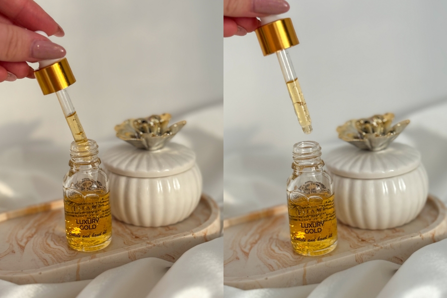 Za početak me ugodno iznenadila količina ulja jer je 15 ml odlična količina u odnosu na cijenu proizvoda. Ono što ovo ulje izdvaja od mnogih drugih jest praktična ambalaža te listići zlata. Bočica je staklena i dolazi s pipeta aplikatorom što će olakšati apliciranje na ruke i nokte. Listići zlata daju pravi dašak glamura, a i zanimljivo izgledaju na dlanovima. Osim zlata, prava vrijednost su njegujući sastojci: jojoba ulje, maslinovo ulje, keratin te vitamin B. Ulje nije nimalo masno ili ljepljivo, već je vrlo lagane i nježne formule te se odmah upija i pruža vidljive rezultate.