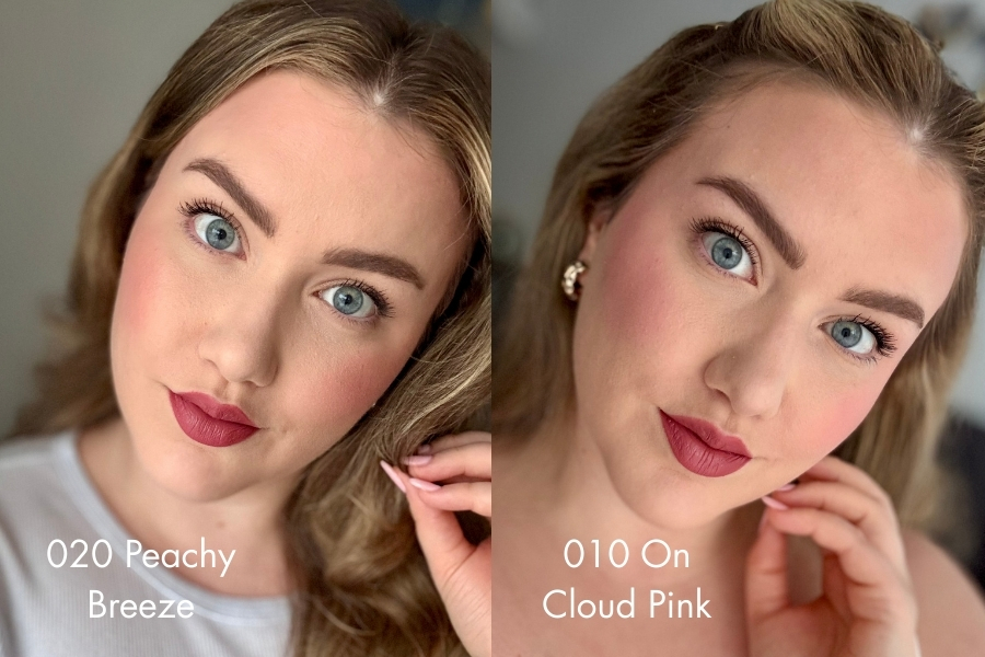 Nijansa 010 On Cloud Pink jest ružičasta sa zlatnim sjajnim česticama, a 020 Peachy Breeze jest nježne breskvaste boje sa zlatnim česticama. Mogu se nanositi samostalno ili povrh tekućeg rumenila. Obje nijanse mi se sviđaju i na licu izgledaju jako lijepo, a moj favorit je, naravno, nijansa 010 On Cloud Pink. Lako se nanose s bilo kakvim četkicama, a swatch na ruci je vrlo pigmentiran. Na dodir je svilenkasto i lako nadogradivo pa se ne morate uplašiti kako ćete pretjerati s apliciranjem.