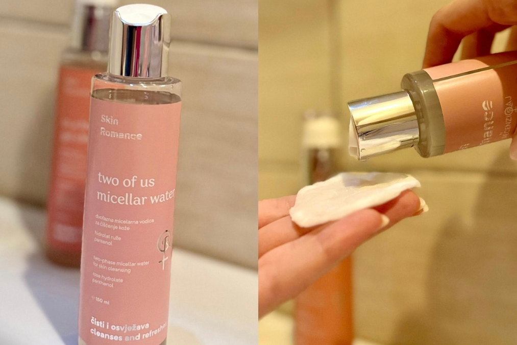 Micelarna otopina Skin Romance Two of Us pokazala se kao proizvod koji savršeno odgovara mojim potrebama. Njezina formula sastoji se od dvije faze – uljne i vodene – koje je prije korištenja potrebno dobro protresti kako bi se aktivirale obje komponente. Nakon toga malu količinu proizvoda nanosim na blazinicu i nježnim potezima prelazim preko lica, bez ikakvog trljanja.