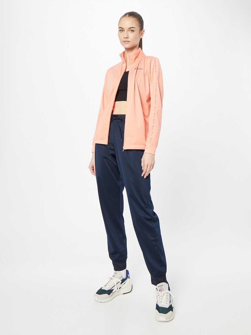 Champion sportski komplet koji se sastoji od crnog donjeg dijela i narančastog gornjeg dijela. Gornji dio ima podignuti ovratnik i zatvarač te bočne džepove. Iznimno praktičan komplet za svakodnevno nošenje. Vrlo lagan i mekan materijal koji se lako održava. Košta 47,61 € i može se kupiti na About You web shopu.