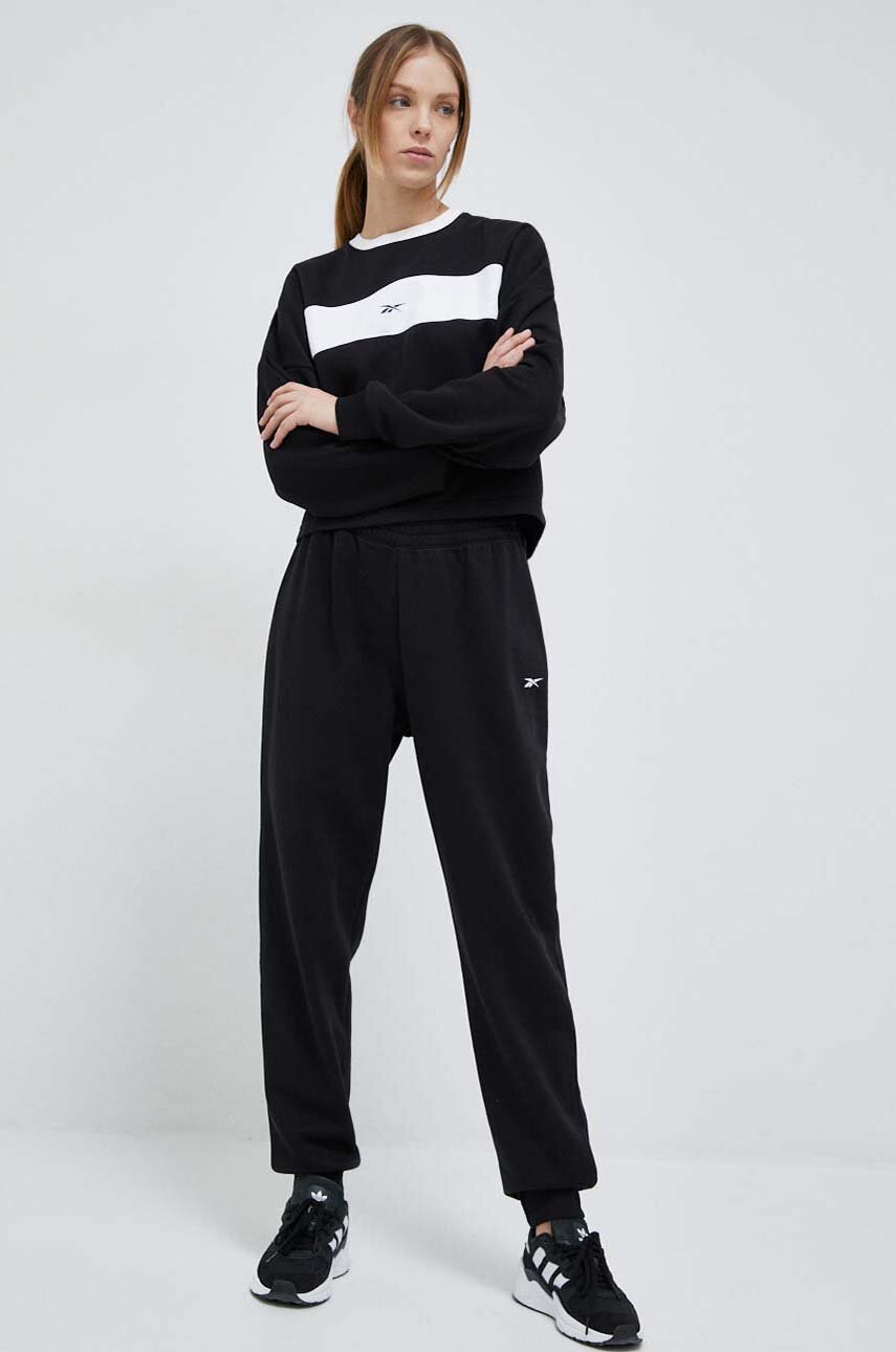 Gotovo u potpunosti crna Reebok trenirka širokog kroja. Napravljena je od 70 % elastičnog materijala i ima minimalistički bijeli uzorak sa znakom brenda, a gornji dio nema zatvarač. Zbog svog širokog kroja jako je ugodna za nošenje. Košta 43,90 € na Answear web shopu.