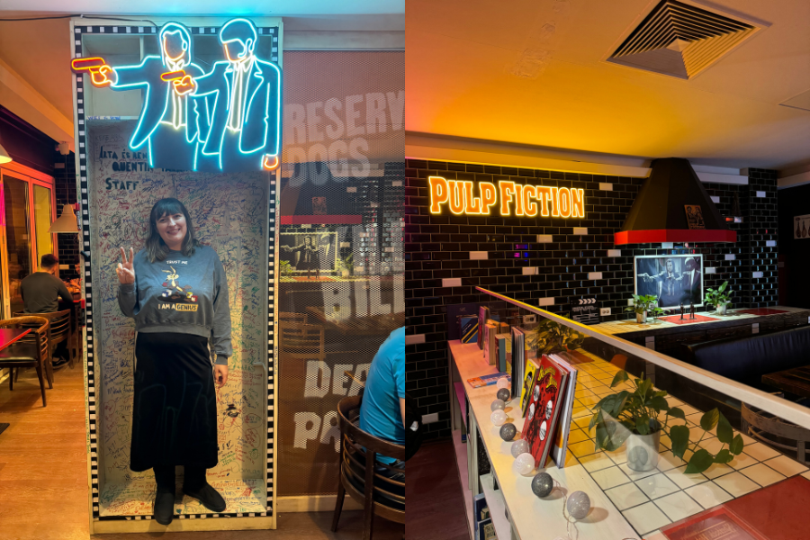 Cijeli je interijer ovog neobičnog burger bara posvećen filmovima Quentina Tarantina. Već pri ulasku osjetit ćete poseban šarm ovog mjesta – svaki detalj je pomno osmišljen kako bi vas podsjetio na kultne scene iz njegovih filmova. Od namještaja do ukrasa, svaka sitnica priča priču o Tarantinovom jedinstvenom stilu. Na velikom ekranu kod šanka neprestano se prikazuju scene iz njegovih filmova, a glazba koja svira, naravno, iz njegovih je slavnih soundtrackova što stvara autentičnu atmosferu koja će svakog ljubitelja filmova odmah osvojiti.