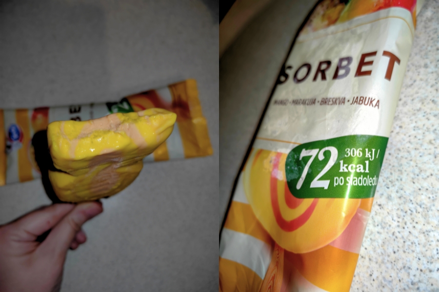Sorbet je zamišljen kao laganiji sladoled koji kombinira više voćnih okusa – mango, marakuju, breskvu i jabuku. Već na prvi zalogaj osjeti se da je riječ o potpuno drugačijem tipu sladoleda u odnosu na kremaste King varijante.