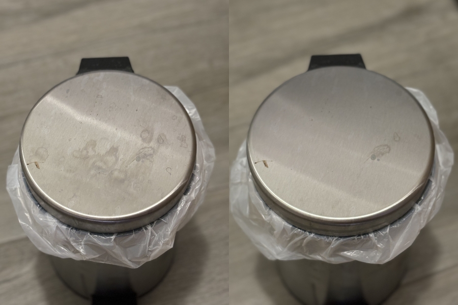 Prema gore navedenim koracima, ovaj proizvod upotrebljavam da bih očistila vanjske rubove pećnice koji su od inoksa te vjerno prikazuju i najmanju mrlju. Na fotografiji možete vidjeti kako je to izgledalo prije te nakon korištenja ovog proizvoda. Kada sam već postigla tako sjajne rezultate, pomislila sam što bih iduće mogla s tim očistiti i sjetila se male kante koju imam u toaletu. Budući da je kanta isto od inoksa, apsolutno svaka mrlja vidi se i ne mogu ju lijepo očistiti.