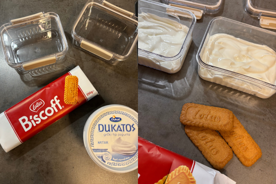 Kao ljubiteljica cheesecakea odlučila sam ga isprobati pa sam tako brže bolje otišla kupiti sastojke i odabrala sam Dukatos (grčki tip jogurta) te Biscoff Lotus kekse. Zaista mi se ne sviđa ova ideja da hrpu keksa trpam u veliku kutiju jogurta pa sam odmah sve lijepo složila u posudice i tako dobila dva deserta čija je kalorijska vrijednost otprilike 300 kcal (125 gr jogurta i pet keksića po porciji).