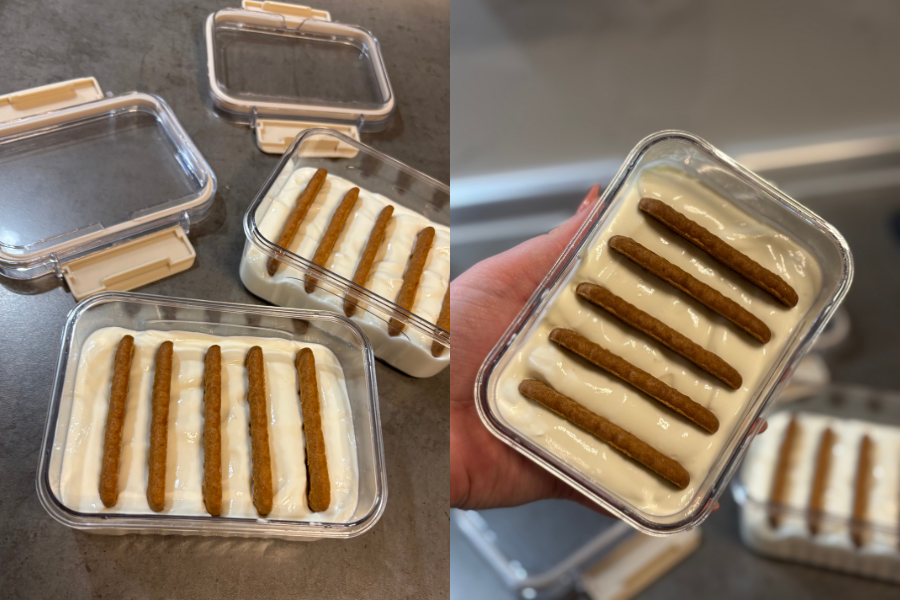 Jogurt sam rasporedila i potom okomito utisnula pet keksića u svaku posudu. S obzirom na to kako prema originalnom receptu ono ide u hladnjak preko noći – isto sam napravila i ja, no bilo bi bolje da sam držala u hladnjaku samo dva do tri sata. Vjerujem kako bi to na ovu manju količinu bilo dovoljno da se keks omekša.