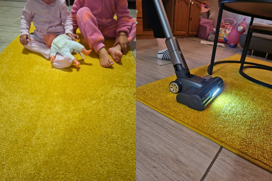 Ovaj naš žuti "tvrdoglavi" tepih često je žrtva dječjih igrica i nemara, a JIMMY H11 Pro odlično ga je usisao, isto kao i kutna područja oko kutne garniture gdje se najčešće nakupe dlake i krupnije čestice smeća. Oduševio me i nastavak za čišćenje tkanina kao što su, primjerice, kutna garnitura i stolice. Ima dva ovakva nastavka, a ja sam za svoje stolice upotrebljavala tanji tako da dođe do teško dostupnih mjesta.