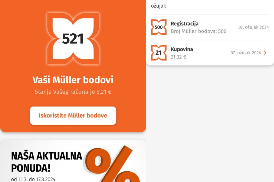 Već godinama imam karticu i aplikaciju dm drogerije i često aktiviram kupone, skupljam bodove i planiram si uštedu pri kupovini. Iz navedenog razloga njihova je aplikacija moj ultimativni favorit, uz činjenicu da ima brojne pristupačne artikle. S druge strane, u Müller često uđem zbog određenih artikala kao što su slatkiši, parfemi i kozmetika. Naravno da svaki put izađem lakša za značajan iznos, ali bez ikakve nagrade. Ova aplikacija to bi trebala promijeniti, a trenutačno na svim blagajnama u Müller poslovnicama možete pronaći informativni letak.
