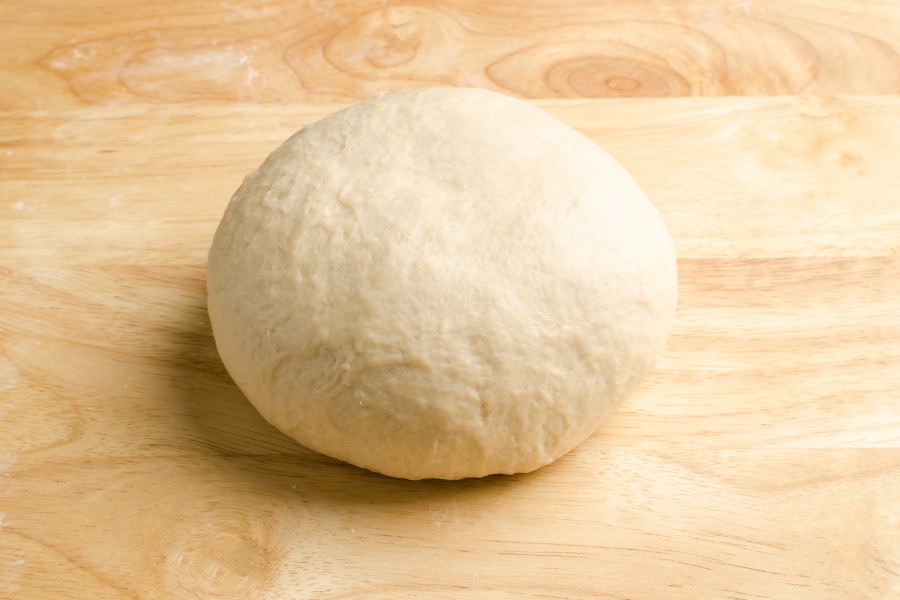 4. Nakon što se poslije jednog dugog miješenja i jednog podizanja tijesto udvostručilo, istresite ga iz posude na pobrašnjenu podlogu. Rukama još vrlo malo i nježno izmijesite da bi se mogla oblikovati štruca pa ju stavite u namašćenu i dobro pobrašnjenu tepsiju.
