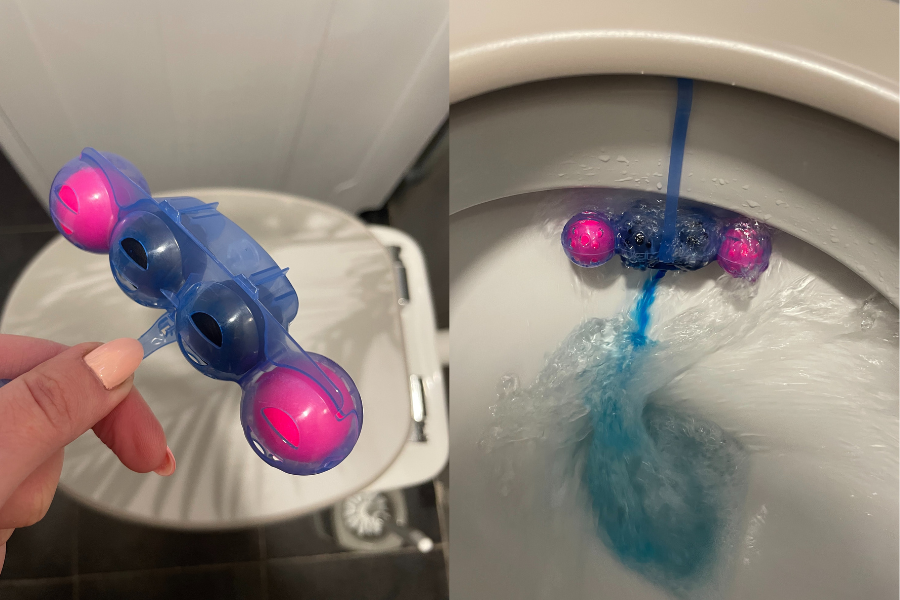 - vidljivo čisti WC školjku pri svakom ispiranju – više od 80 % ispitanica jako je zadovoljno s vidljivo čišćom WC školjkom nakon upotrebe. Kuglice koje otpuštaju boju i obojena voda, ostavljaju dojam dodatne čistoće, a mnoge su primijetile da se kamenac i prljavština manje zadržavaju