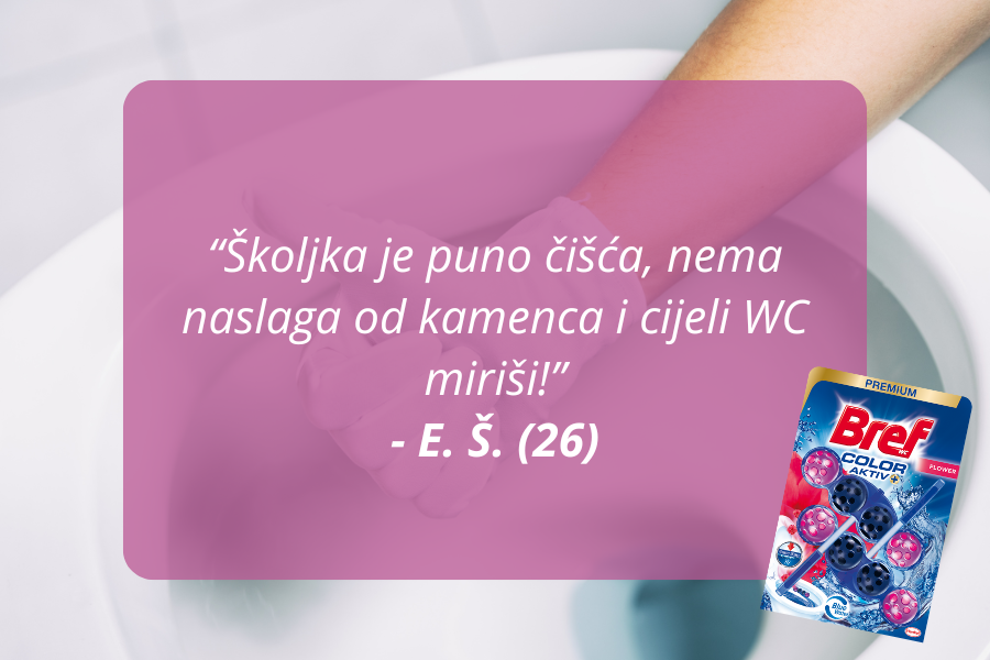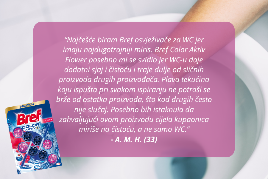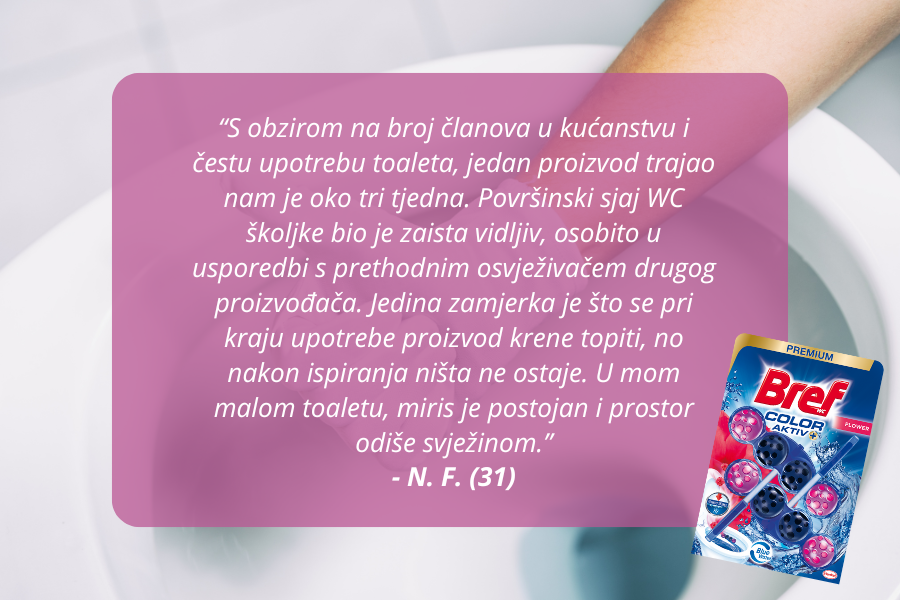 Kupaonica je prostor u kojem svaka žena želi osjetiti čistoću, svježinu i ugodu, ali rijetko tko ima vremena ili volje svakodnevno ribati WC školjku. Neugodni mirisi, tragovi kamenca i osjećaj da WC nikad nije dovoljno čist, često su izvor frustracije. Upravo zato proizvodi koji obećavaju dugotrajnu svježinu i čistoću bez puno truda izazivaju veliko zanimanje. Međutim, mogu li zaista ispuniti očekivanja? U potrazi za rješenjem 110 čitateljica Ženskog recenziRAJa prihvatilo je izazov i testiralo Bref Color Aktiv Flower – inovativni proizvod koji obećava novu razinu higijene i mirisa u kupaonici.