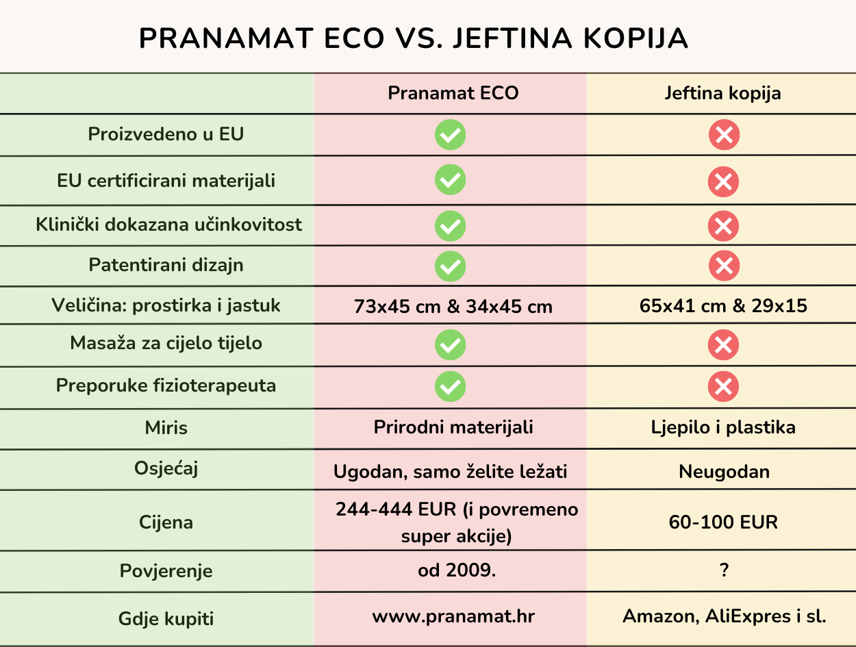 Kako bi postigao potpuni učinak akupresure, brend Pranamat proizveo je prostirke koje su prožete oštrim cvjetovima lotosa koje na prvi dojam podsjećaju na iglice. Svrha im je stimulacija živčanog sustava, poticanje protoka krvi i cirkulacije limfe. Nakon što sam podijelila svoje oduševljenje ovom prostirkom, brojni su se bacili na traženje svog primjerka i ustanovili da se "gotovo identične" prostirke mogu pronaći po značajno manjoj cijeni na AliExpressu, Amazonu i sličnim web shopovima. Naravno da me zanimalo o čemu se radi. Prostirke su doista izgledom podsjećale na Pranamat ECO prostirke, čak su i boje bile uvjerljivo iskopirane, međutim nije mi bilo jasno zašto ljudi onda kupuju Pranamat prostirke kada na raspolaganju imaju pristupačnije alternative.