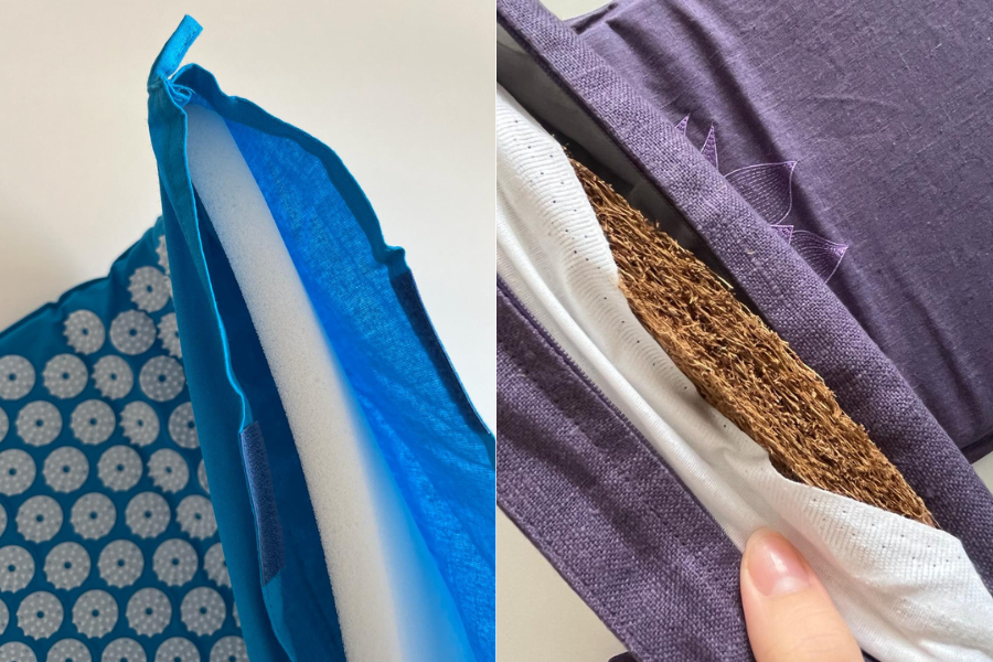 Prvo ću se osvrnuti na izgled i osnovne karakteristike proizvoda. Pranamat ECO prostirka dolazi u navlaci od 100 % prirodnog lana koja se može skinuti, dok je punjenje jastuka od 100 % prirodnih heljdinih ljuskica. Sama prostirka izrađena je od kokosovih vlakana. Masažni set s Amazona načinjen je od spužve pa je sama prostirka tanja i mekša, a navlaka mu je napravljena od kombinacije pamuka i polistirena (plastičnog materijala). Navlaka na prostirci s Amazona gotovo je prozirna, pod rukom uopće nije ugodna i djeluje puno nekvalitetnije nego lanena Pranamatova navlaka. Također, cijeli set u ruci je neusporedivo lakši od Pranamatovog. Na prvi pogled ove prostirke djeluju jako slično, međutim materijal na odaje da se radi o jeftinom setu pri čijoj izradi definitivno nisu vodili računa o kvaliteti materijala.
