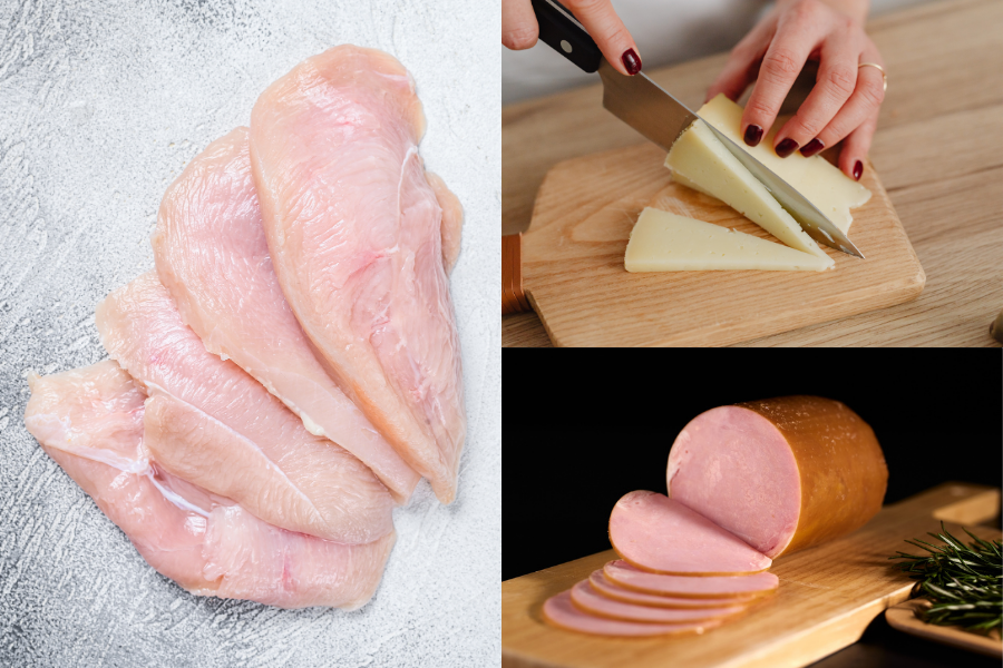 1. Pileće filee isfiletirajte i lagano istucite batom da dobijete što veću površinu. Piletinu posolite, popaprite i na jednu stranu filea stavite fete sira i šunke te drugom stranom preklopite i učvrstite čačkalicama.