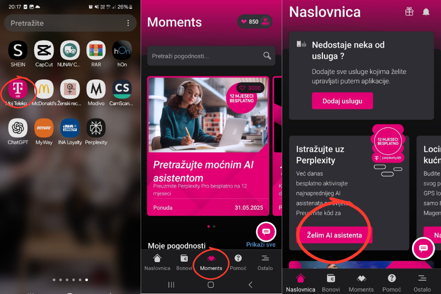 Cijena ovog asistenta inače iznosi 233 eura godišnje, no s obzirom na to da je ovo velika inovacija, Hrvatski Telekom je prvotnom idejom poklanjao 20 000 besplatnih licenci kako biste mogli uživati narednih 365 dana u čarima ovog AI asistenta, no s obzirom na veliki interes, podijeljeno je više od 30 000 besplatnih kodova, a akcija traje i dalje. Postupak je vrlo jednostavan: na pametni telefon skinete Moj Telekom aplikaciju, uđete u prozorčić Magenta Moments (zaokruženo crvenom bojom na fotografijama) i nekoliko dana skupljate srceta i kada dođete do 3 000, aktivirate Perplexity Pro. Srceta su nešto slično kao poeni/novčići, a dobijete ih aktivacijom i ulaskom u aplikaciju i raznim aktivnostima koje su ondje detaljno popisane.