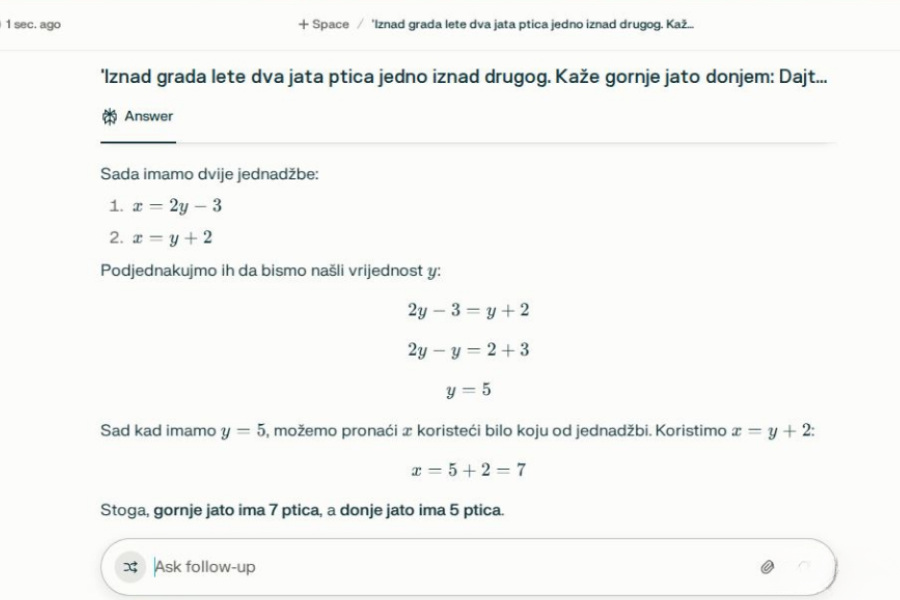 Našem asistentu unijeli smo problemski zadatak i odabrali Academic način rada. Zadatak je glasio: "Iznad grada lete dva jata ptica jedno iznad drugog. Kaže gornje jato donjem: Dajte nam jednu pticu i bit će nas 2 puta više nego vas. Na to će donje jato gornjem: Dajte vi nama jednu pticu i bit će nas jednako. Koliko ima ptica u kojem jatu?" AI asistent dao nam je odgovor na naše pitanje i nekoliko poveznica na srodne zadatke.