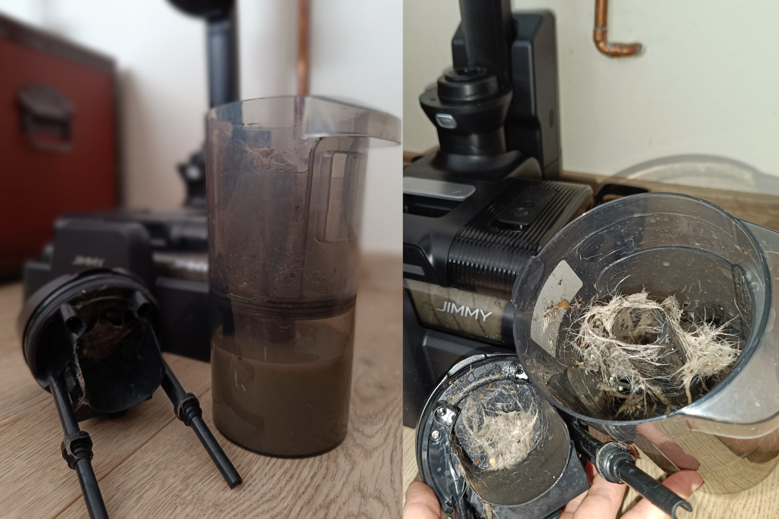 Nakon što je pranje podova završeno, potrebno je usisavač staviti u uspravan položaj da bi se mogao sam očistiti. Rotacijska četka vrti se u oba smjera dok se na nju ispušta čista voda, a iskorištena prljava voda odvaja se u spremnik za prljavu vodu što znači da nema nikakve ručne manipulacije i dodatnog čišćenja rotacijskom četkom – dovoljno je pritisnuti gumb i Jimmy će sve ostalo napraviti. Ovaj dio čišćenja dosta je bučan, no kratko traje pa mi je prihvatljiv, a i znam da ovaj proces osigurava čistoću valjka (kako generalno, tako i za svako buduće čišćenje), njegovu dugotrajnost i da se zbog toga neće zadržavati neugodni mirisi u usisavaču. Nakon ovog dijela usisavač započinje sa sušenjem rotacijske četke, otvora zraka i spremnika za vodu s pomoću vrućeg zraka. To je proces koji traje oko četiri sata, ali je relativno tih (mogu to opisati kao white noise koji se vrlo lako može zanemariti) i što je još bitnije – sprječava pojavu neugodnih mirisa i plijesni u dijelovima usisavača.