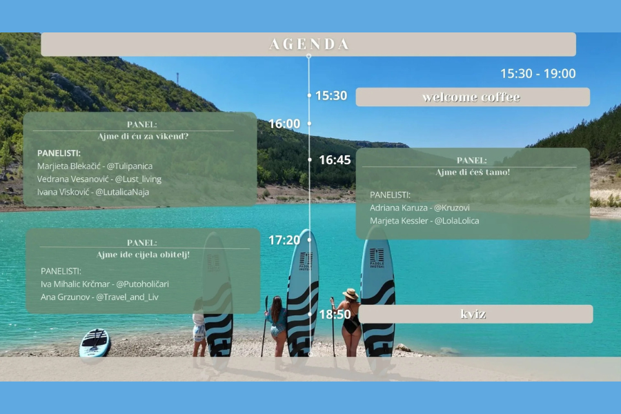 Iva Mihalić Krčmar, polovica najpoznatijeg hrvatskog putničkog bloga Putoholičari, kao mama, otkriva kako izgleda putovanje kada imate dijete i što obavezno treba ponijeti na put. Ana Grzunov (@travel.and.liv) podijelit će priče iz kampera, planina i luksuznih destinacija te dati savjete kako obiteljski odmor pretvoriti u nezaboravnu avanturu.
